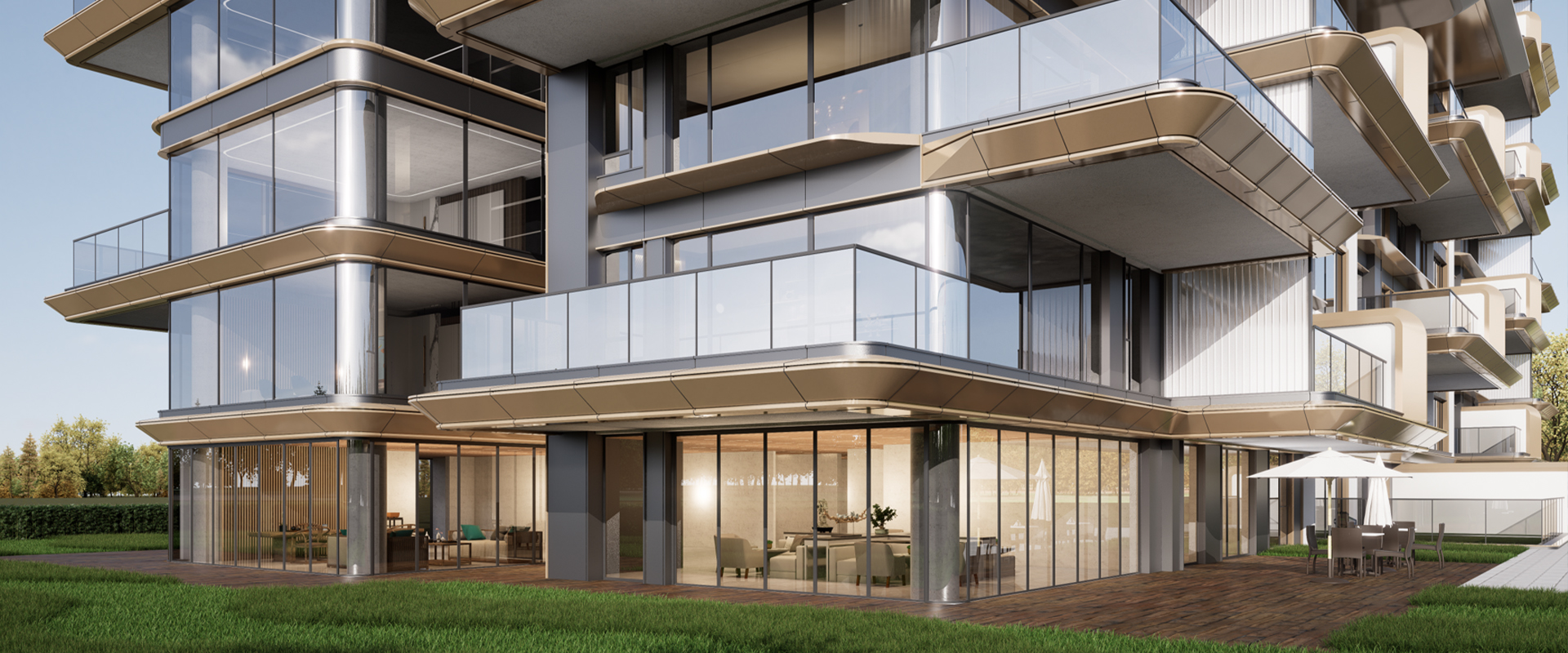 建筑通体主要为香槟色,立面以两层为单元进行统一设计,呈现出整体主次分明,挺拔向上的建筑形象。翼板尺度纤细,线条顺滑,出檐深远,质感细腻,立面充满未来感的同时又不失家庭应有的温和元素。